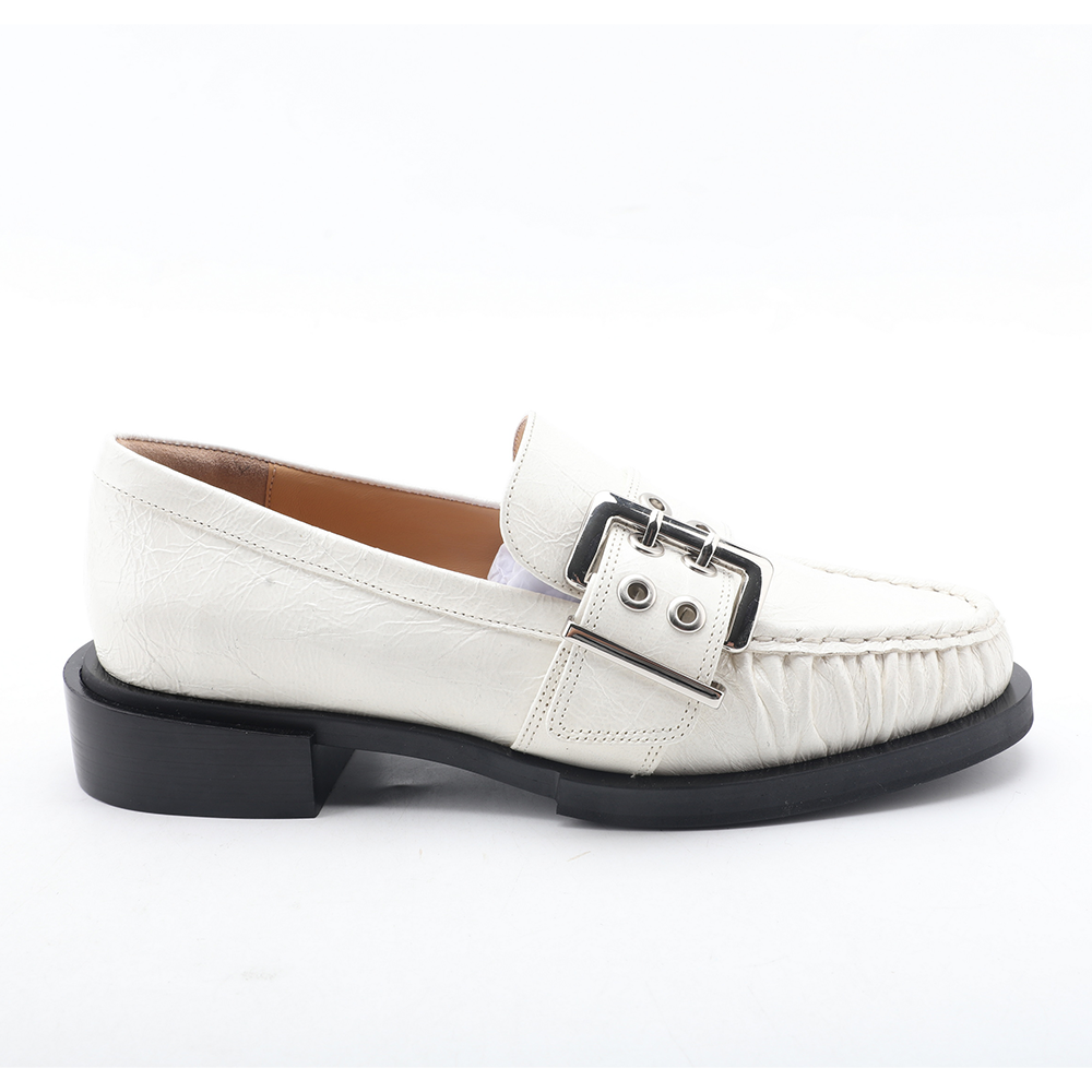 Feature:White crinkled leather loafers with silver-tone buckle detail and black block heel. |