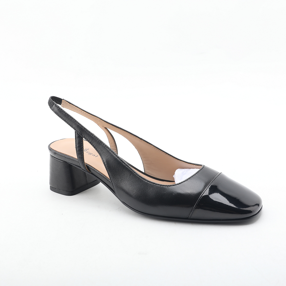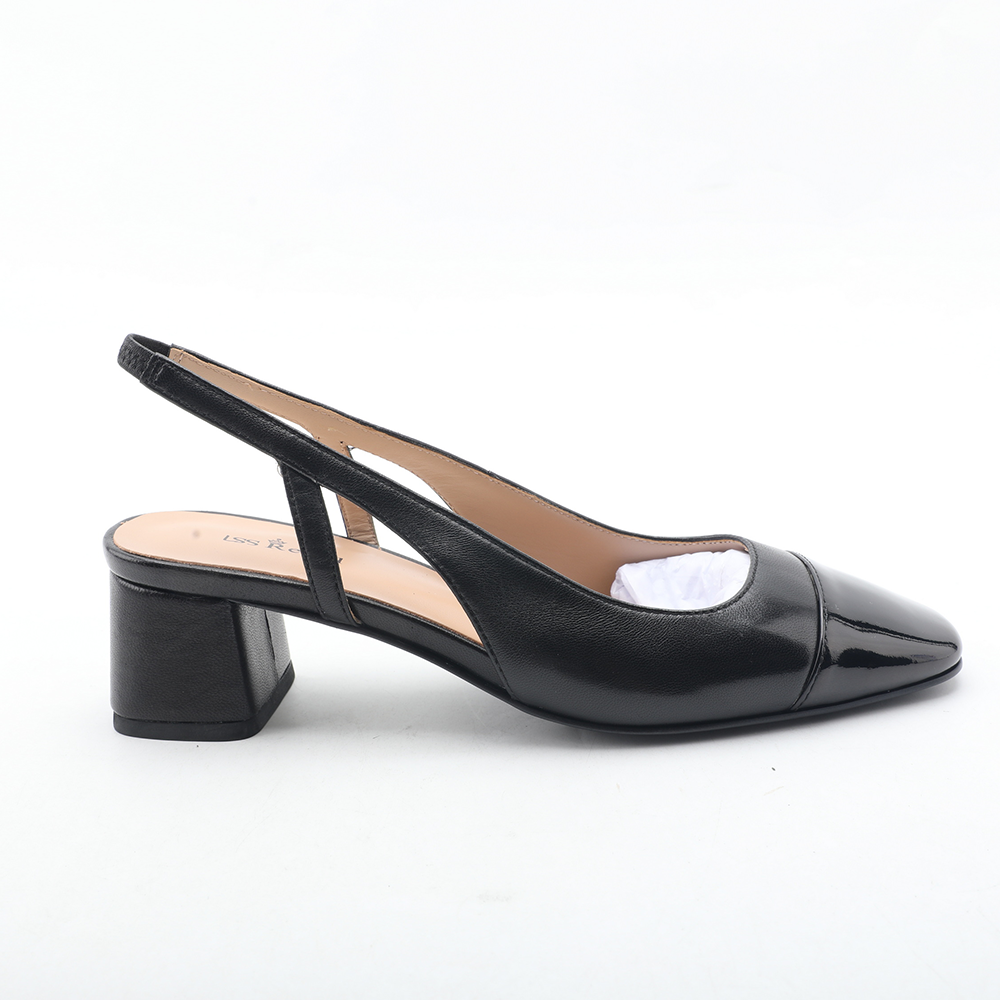 Feature:Black & beige slingback pumps with square toe, block heel, and patent leather toe cap. |